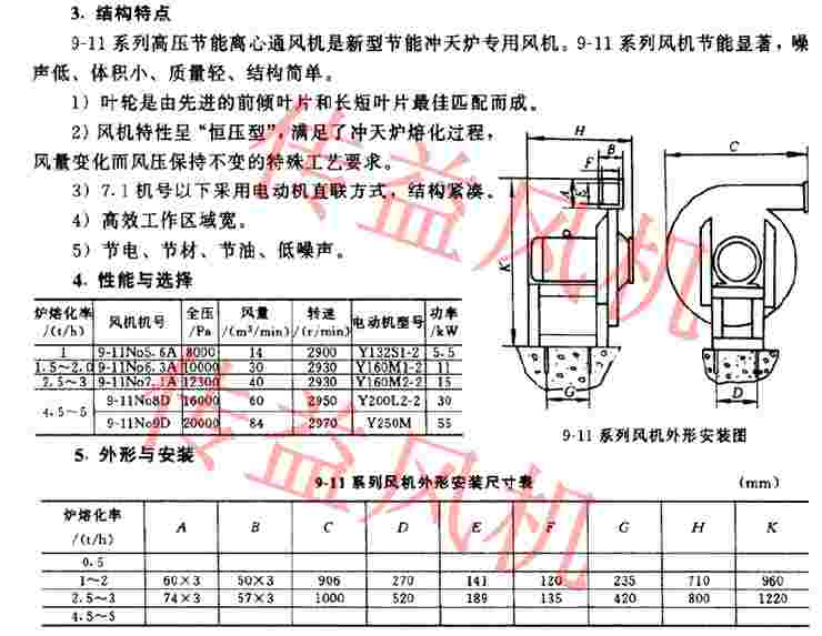 9-11高压离心风机是恒压型离心风机,电机功率从5.5kw至55kw,根据熔炉熔化率的不同,有五种规格,最高风压20000帕,风量5040立方/小时,传动方式有电机直联和联轴器传动两种